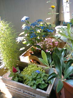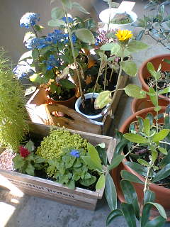 そんなこんななエコな毎日?ベランダのガーデニング熱もさめやらず。写真のように、小奇麗にまとまっています。ただ、虫が増えてきて、じゃあ「殺虫剤?」ってなるんだけれど、ハーブやオリーブの木に薬品まいていいのだろうか…って、これも心配。ガーデニングショップに、人体にも影響がない殺虫用の何か(これがあまりよくわからない)っていうのが売ってるのだけれど、4000円というわけのわからない値段がついている。んー、虫を許容するか、4000円を投資するか、と悩むうちに、気もい色の「蛾」をベランダで発見。週末、もちょっと庶民的な園芸ショップに出かけて相談してみよう…